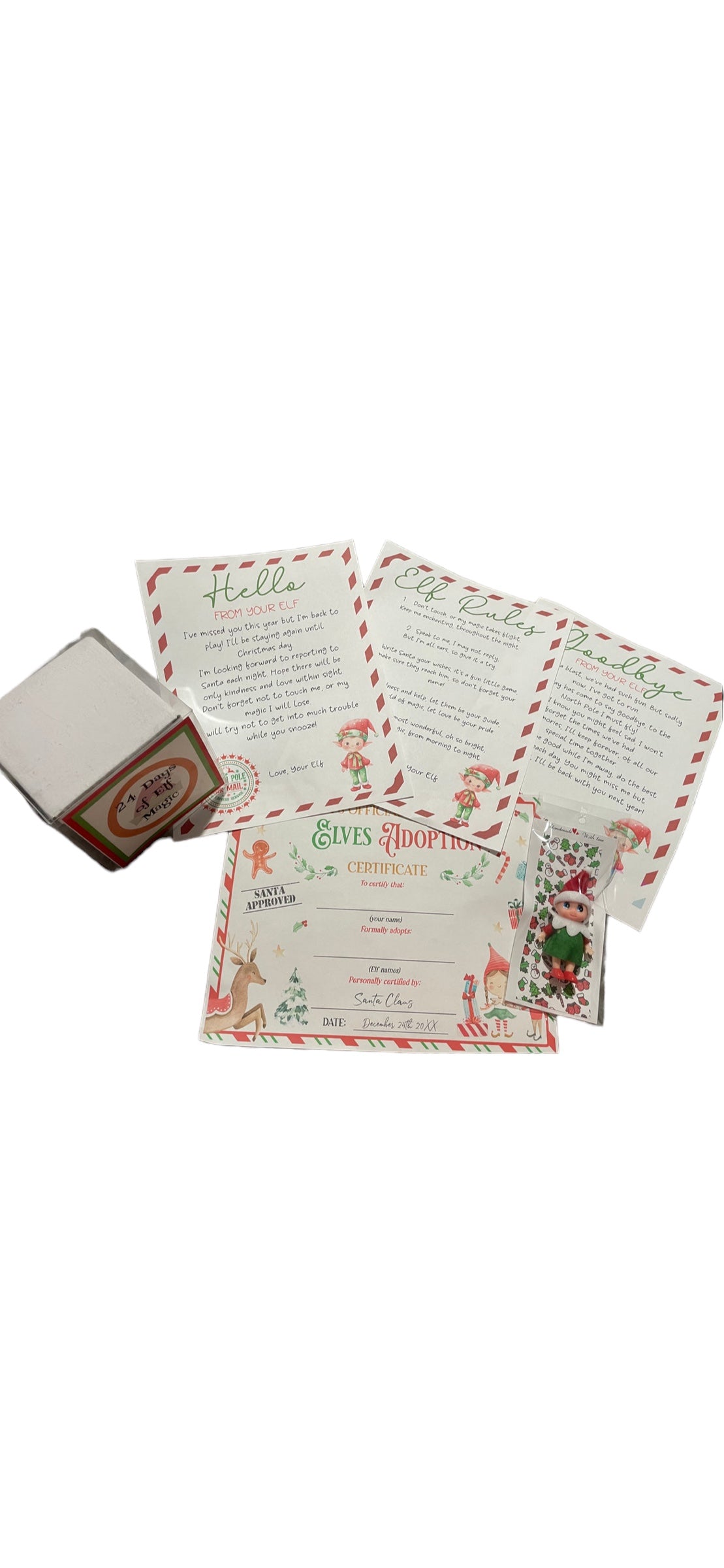 Elevate your Elf game with our  24 day Elf Kit, filled with enchanting surprises to keep the festive spirit alive all month long! 24 days of elf fun. Can’t think of ideas to do with your elf? Grab this set and you don’t have to worry about that . This kit has 24 days of things to do for the elf. Surprise the kids every day with something new.Â